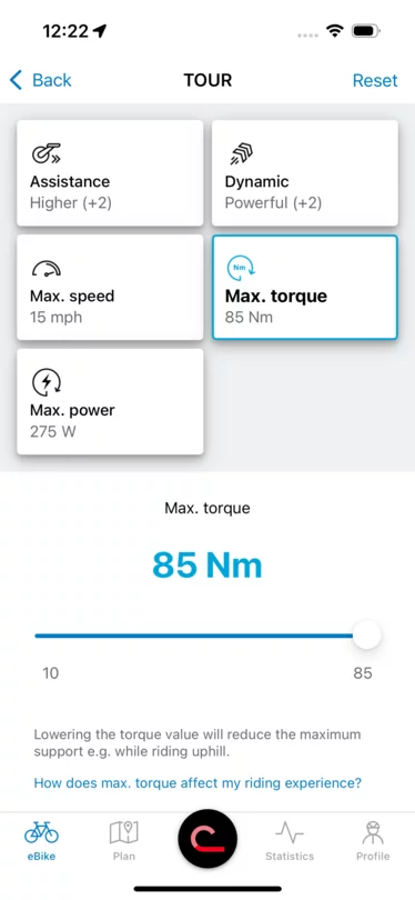 High torque ensures a strong and powerful riding experience. It ensures rapid acceleration, especially at low cadences. Starting on steep ascents is also made much easier. Lower torque can protect the battery and increase the range. If you set the maximum torque to a low value, the drive unit will be able to reach the set torque very quickly, depending on the level of support. With a high setting, this is a maximum value that is not necessarily reached.