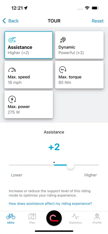 The ‘Assistance’ setting increases or decreases the level of assistance of the drive unit based on your own power. Reduce the assistance level if the riding mode feels too strong or if you want to increase the level of difficulty for a more intensive workout. A high assistance level, on the other hand, increases the power of the drive unit for a stronger feeling, but also consumes more battery charge.