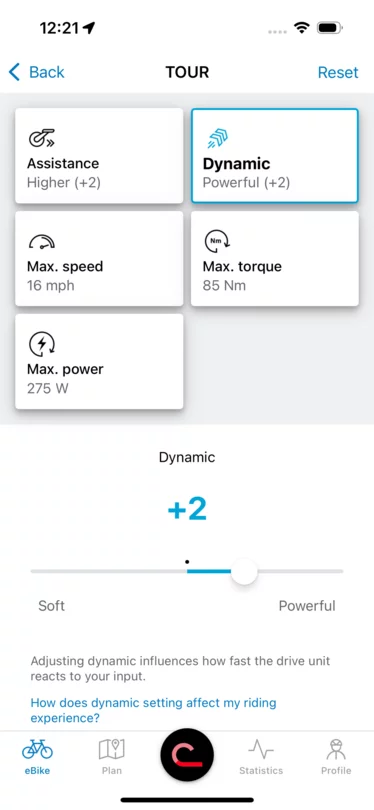 When starting to pedal, the drive unit can either provide gentle support or an immediate boost. The higher the value, the greater the acceleration. High dynamics can make hill starts and acceleration on steep ascents easier… except with eMTBs on muddy or wet hills. At high Dynamic settings, your eBike will be more difficult to handle, especially if you have your Power and Torque settings set high.