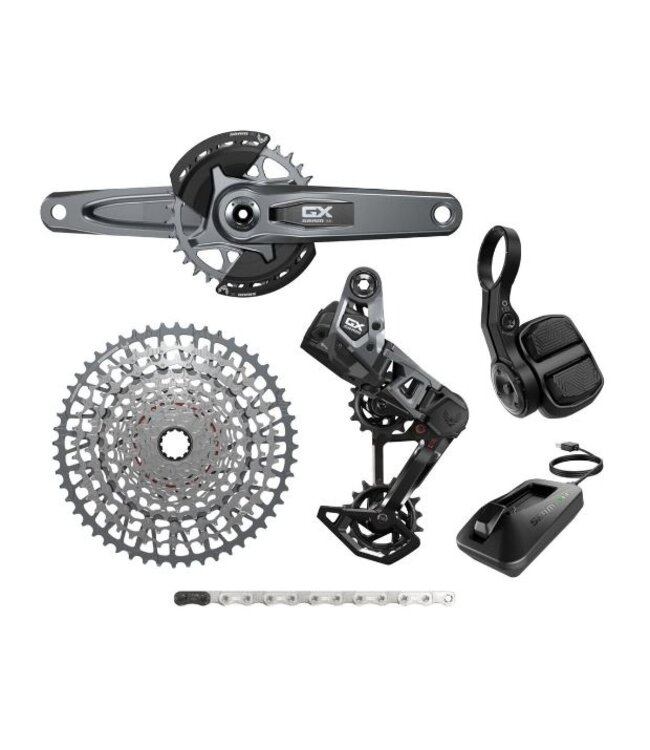 Kit contains Rear Derailleur, Shifter, battery and charger, spider and chainring 36t, cranks 170mm, flat-top chain, XD cassette 10-52.